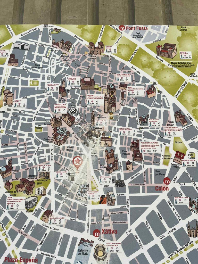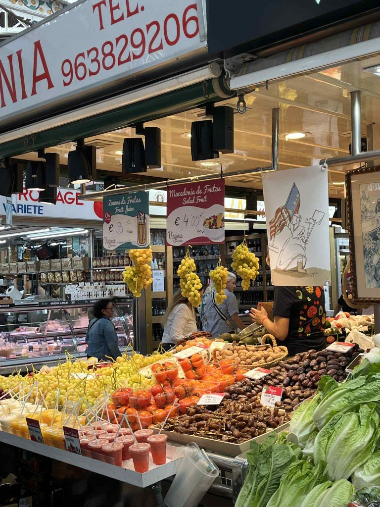 Prva stanica u Valenciji nam je bila Central Market – velika tržnica u kojoj možete naći i isprobati valencijanska jela, slastice, isprobati kamenice, ježeve, paellu, vidjeti domaće proizvode i raznovrsno povrće kojeg kod nas ni nema. Malo dalje od tržnice se nalazi i La Lonja de la Seda de Valencia, gotička palača koja se sastoji od tri dijela, a u sredini je dvorište u kojima su zasađena stabla naranče. Ulaznica je 2€.